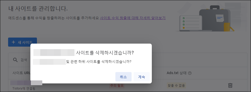 2. 그러면 이렇게 사이트 삭제하시겠냐고 물어봅니다. 계속을 눌러줍니다.