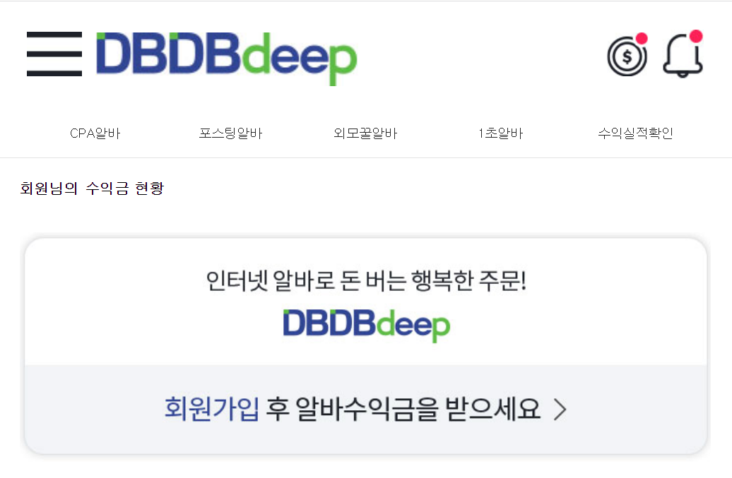 : 디비디비딥(또는 DBDBDeep)은 다양한 방식의 재택 알바를 제공하는 제휴 마케팅 플랫폼입니다. 주로 CPA(코스트 퍼 액션) 광고와 포스팅 알바를 중점으로 한 마케팅 업무를 지원하는 사이트입니다.