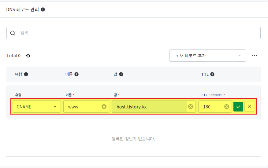 - 유형 CNAME, 이름 www, 값 host.tistory.io. , TTL 180 입력합니다.