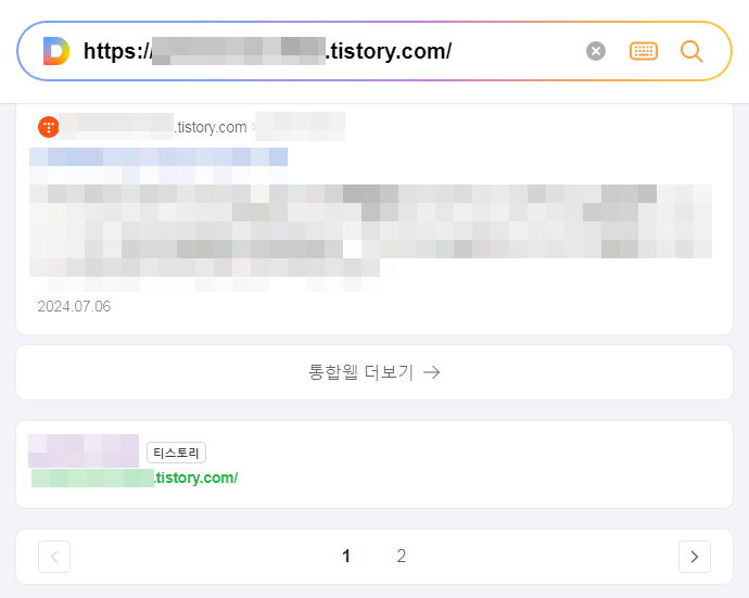 그래서 티스토리 다음 저품질 확인 방법을 알아보았습니다. 방법은 매우 간단합니다. 먼저, 내 블로그 주소를 다음 메인 검색어란에 그대로 검색합니다.