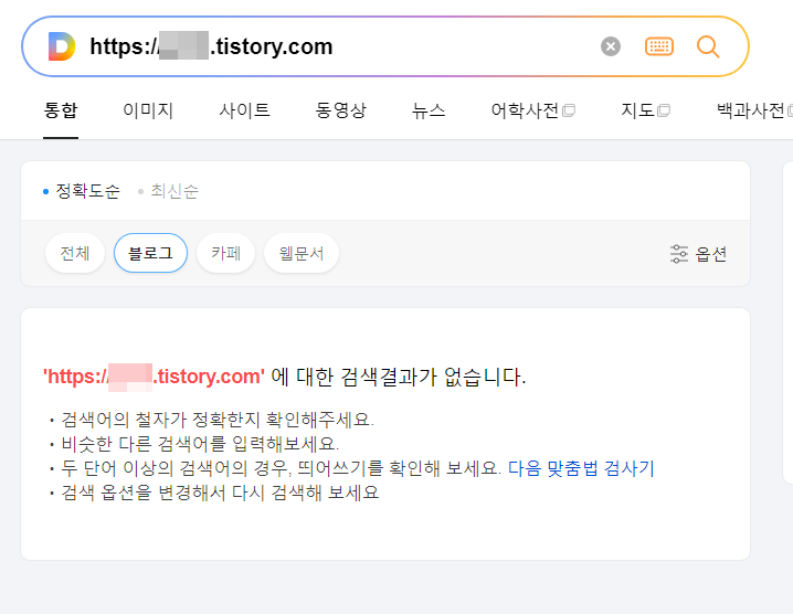 다음은 이렇게 해당하는 주소로 검색했을때 글이 하나도 안나오는 경우가 있는데요. 이는 해당하는 글 전체가 누락된 경우, 다른 말로 통누락이라고 합니다. 몇 년을 노력하면 다시 풀리는 경우가 있다고 하는데요. 다음을 보고 하기 보다는 네이버나 구글을 노리고 쓰다보면 가끔은 풀리는 경우도 있다고 합니다.
