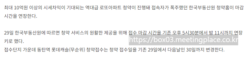 한꺼번에 많은 분들이 몰리는 바람에 계속 서버가 터졌다가, 되었다가 하는 수준인데요, 그래서 오늘 29일 밤 11시까지 연장을 하고 내일(30일) 까지도 동탄역 롯데캐슬 줍줍 무순위 청약 신청을 계속 받는다고 합니다.