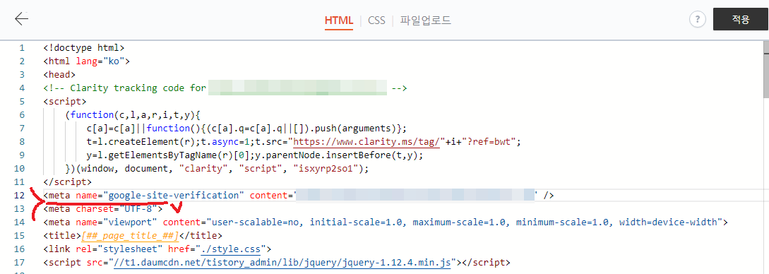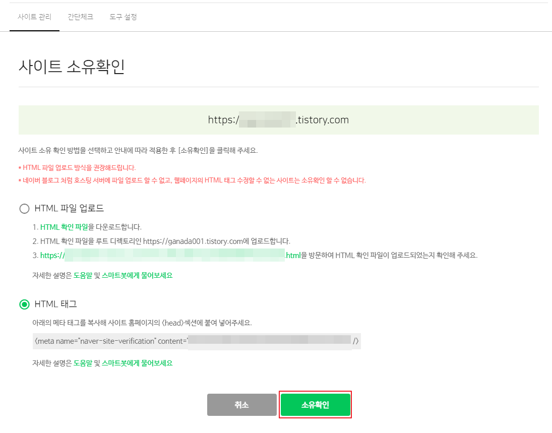 이제는 그 사이트가 내 것인지 확인 해줘야 합니다. 티스토리 등 내가 관리하는 블로그 페이지에 HTML 태그를 넣어주시면 됩니다.
