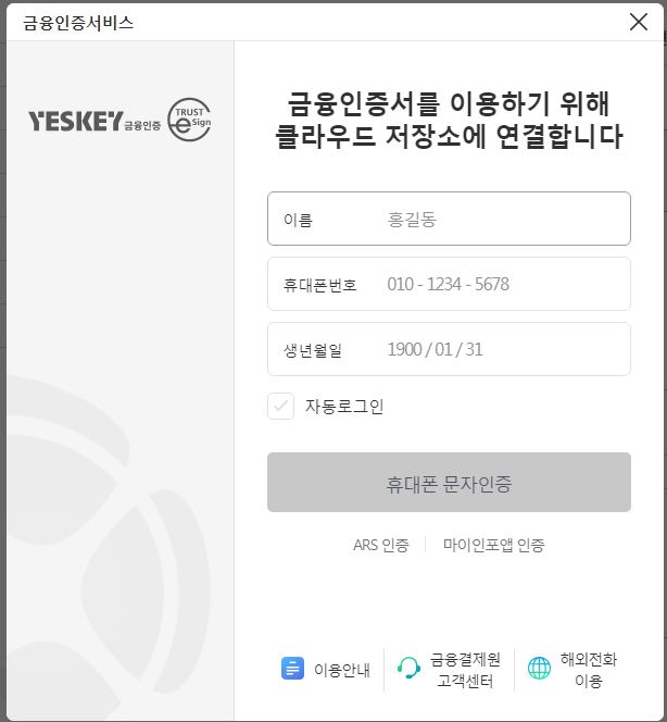 주민번호를 입력하고 로그인을 누르니 이렇게 나의 금융인증서를 이용할 수 있는 클라우드 저장소에 연결할 개인정보를 다시 입력하라고 합니다.