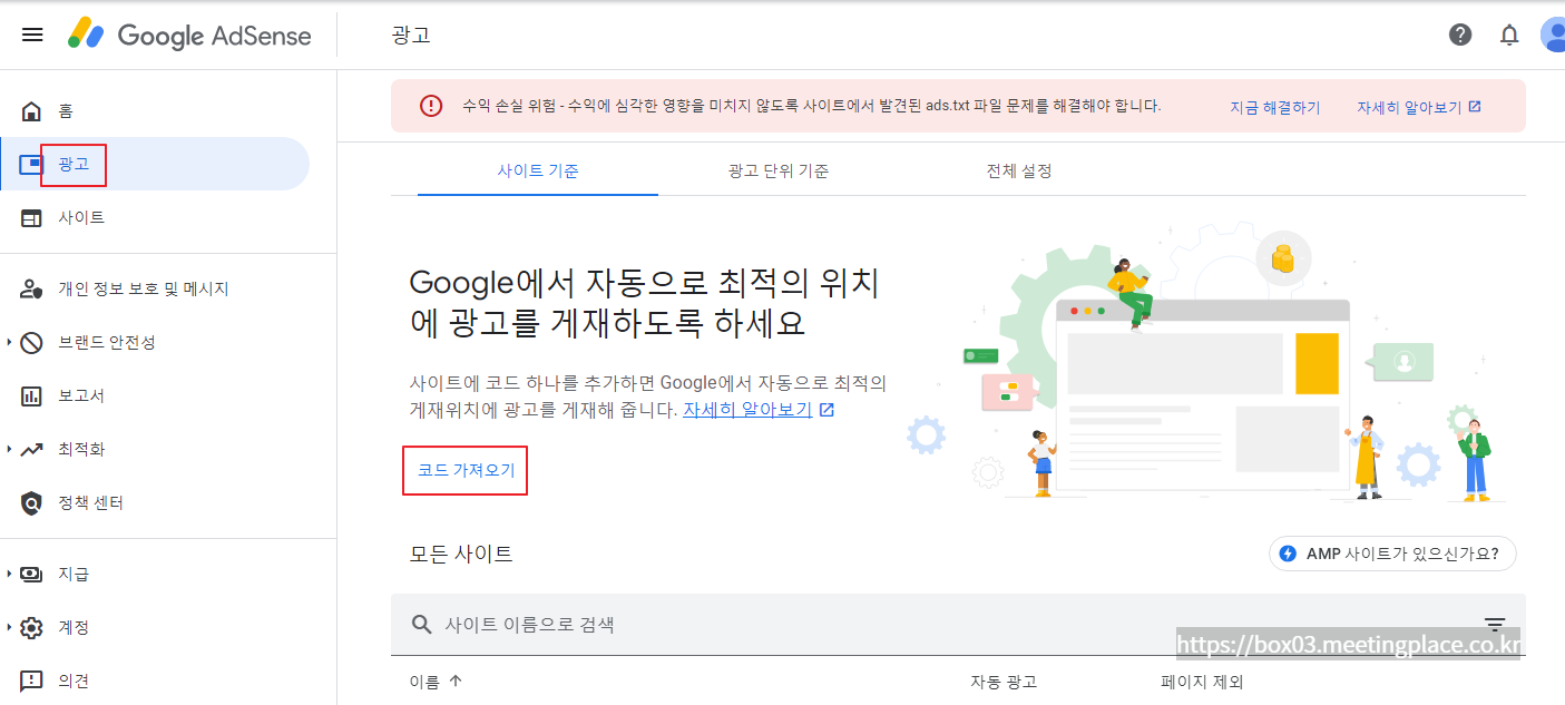애드센스 메인 > 광고 > 사이트 기준 > 코드가져오기