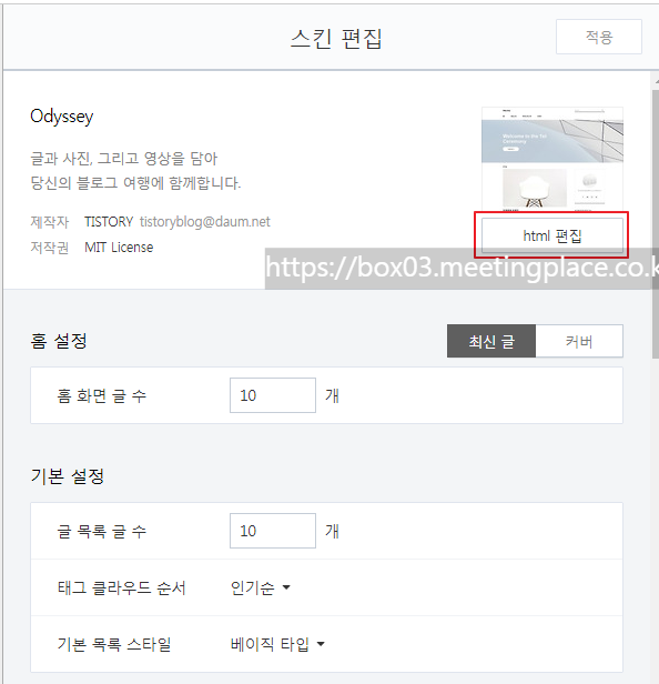 티스토리 설정 > 꾸미기 > 스킨 편집