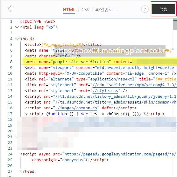 이제는 아까 복사 해둔 메타 태그를 티스토리 스킨편집 화면에서 붙여넣기를 해주시면 됩니다.