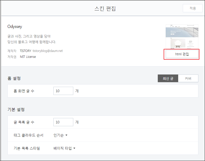 저 같은 경우에는 티스토리 이기 때문에 티스토리의 관리 화면에서 스킨 편집을 눌러주고,