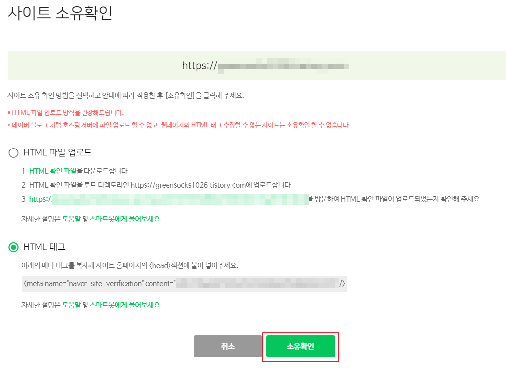 이제 이 사이트가 내것이 맞는지 소유 확인하는 단계인데요.