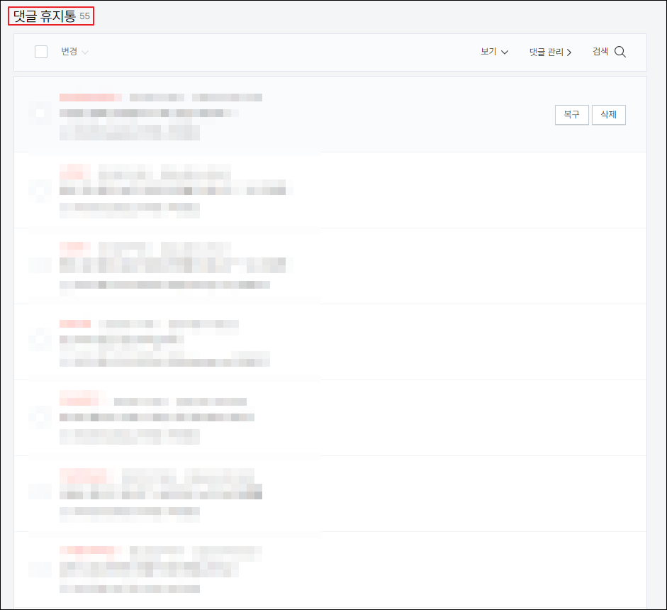 댓글 휴지통에는 복구나 완전삭제 2개만 남아있네요.