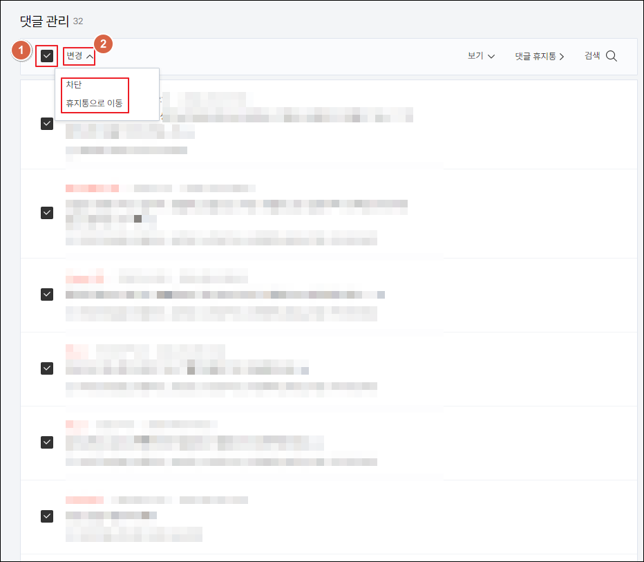 상단에 있는 체크박스를 클릭하면 이렇게 전체 선택이 되는데요. 그 상태에서 옆에 변경을 눌러보면 차단 혹은 휴지통으로 이동이 나옵니다.